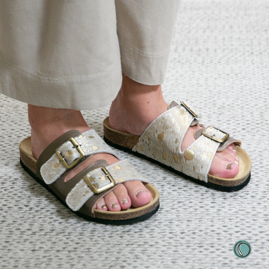 Flockie Sheepskin Sandals | Slip-On |Metallic Gold | Sheepskin, Leather, Cork, Buckles | MADE TO ORDER