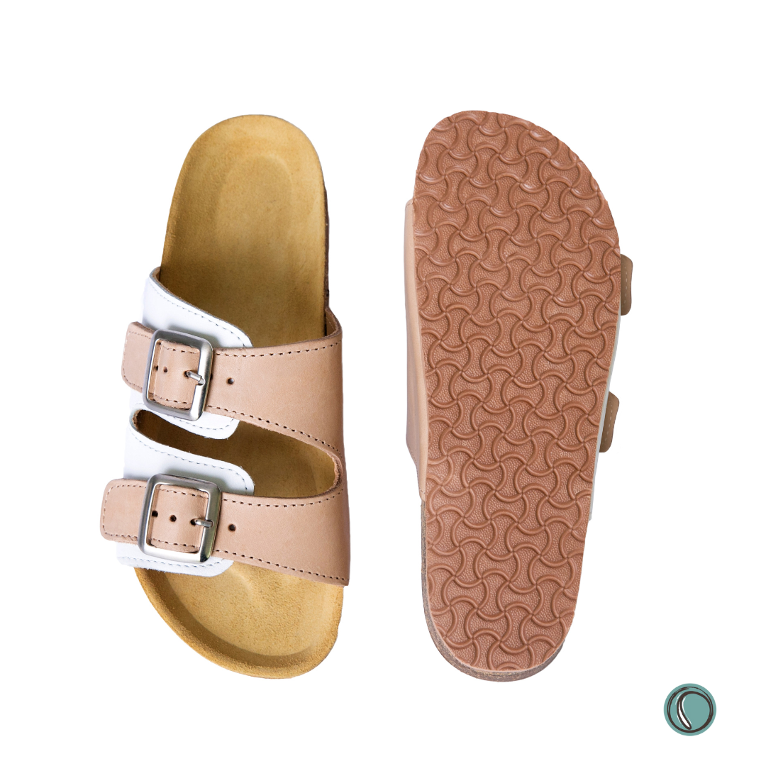 Kenton Sandals | Beigh & White | Slip-On | Leather, Cork, Buckles | Adjustable Straps | MADE TO ORDER
