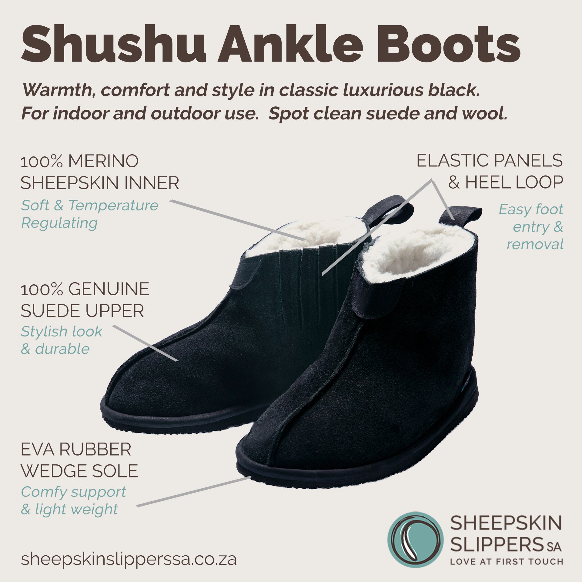 Inspired by farm life in the Eastern Cape - where crisp winters were softened by the natural warmth of sheepskin - our founder, Hazel Hoole, chose the name Shushu, the Xhosa word for ''hot'' for these warm and stylish boots.
